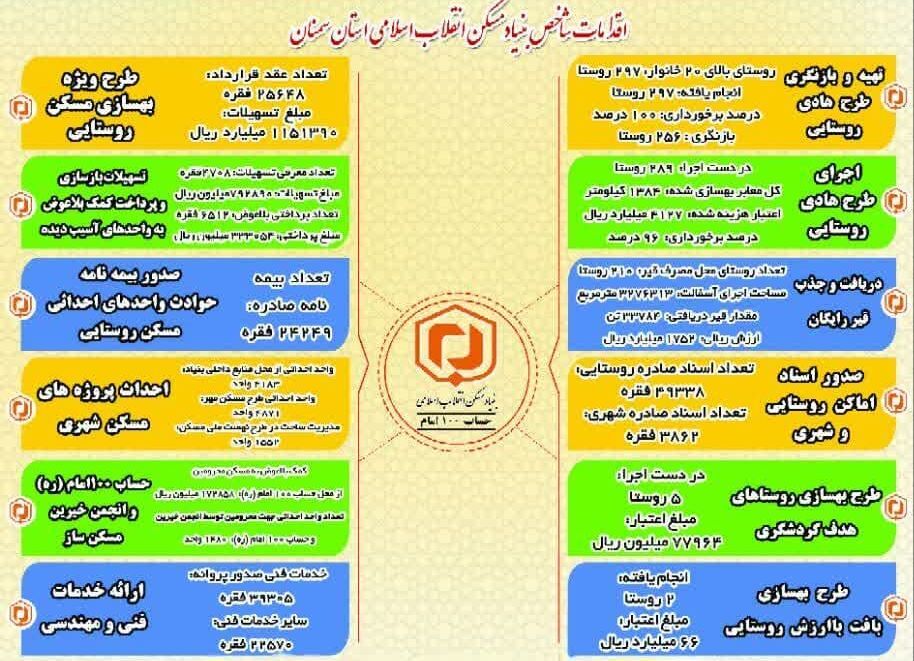 ۱۵۰ مسکن روستایی با استفاده از وام کم بهره اعطایی از سوی ادارهکل بنیاد مسکن انقلاب اسلامی سمنان در سال ۱۴۰۳ ساخته شد که این خانهها نیز با صرف اعتبار ۵۲۵ میلیارد ریال دههفجر ۱۴۰۳ به بهرهبرداری رسید.