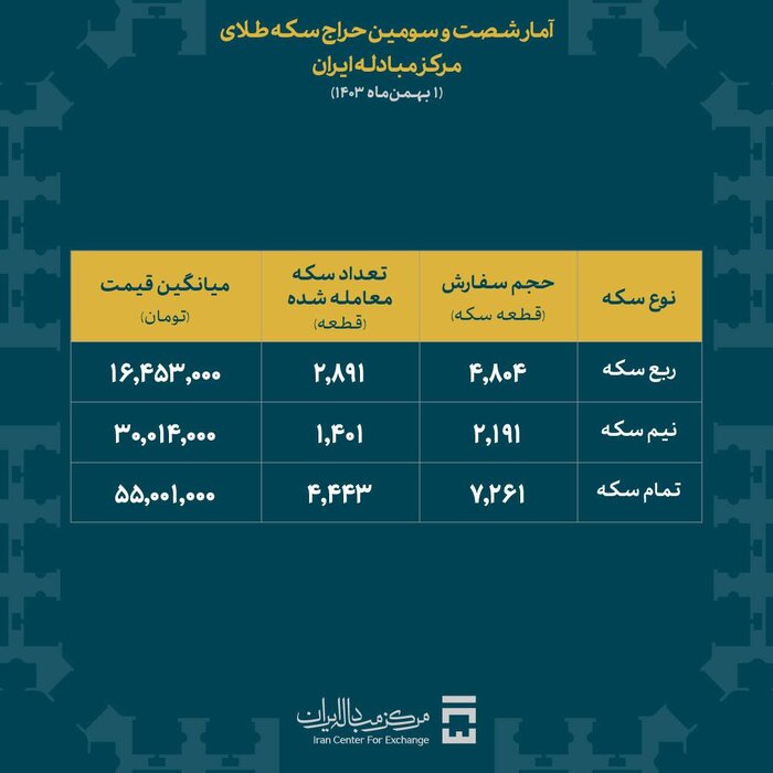 همچنین، از مجموع ۲۱۹۱ قطعه نیم سکه ثبت سفارش شده، ۱۴۰۱ قطعه با میانگین قیمت ۳۰ میلیون و ۱۴ هزار تومان به متقاضیان تخصیص داده شد.