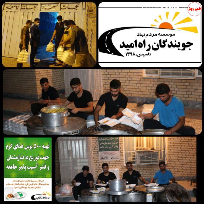 به گزارش دیدگاه نیوز، تعداد ۵۰۰ پرس غذای گرم توسط سازمان مردم نهاد جویندگان راه امید (در شهرستان ایذه) تهیه و به کمک مسئولین اداره بهزیستی و کمیته امداد امام (ره) این شهرستان بین نیازمندان، اقشار کم درآمد، قشر آسیب پذیر جامعه و کمپهای ترک اعتیاد شهرستان توزیع شد