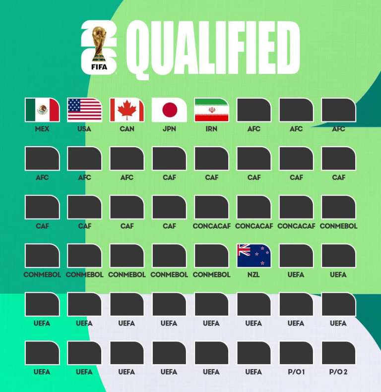 ایران ششمین تیمی است که راهی جام جهانی شده است؛ پیش از این تیم های ملی آمریکا، کانادا و مکزیک به عنوان میزبان و ژاپن و نیوزیلند به عنوان اولین تیم ها جواز حضور در جام جهانی ۲۰۲۶ را کسب کرده اند.