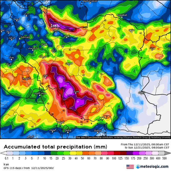 نقشه جدید مدل جهانی GFS نشان می‌دهد طی ۱۰ روز آینده هسته‌های بارشی کم‌سابقه، جنوب‌غرب و زاگرس را هدف گرفته است.