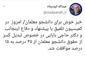 به گزارش دیدگاه نیوز، وی در توییتی نوشته است: خبر خوش برای دانشجو معلمان/ امروز در کمیسیون تلفیق با پیشنهاد و دفاع اینجانب و دکتر حاجی بابایی در خصوص تبدیل کسر از حقوق دانشجو معلمان از ۴۵ درصد به ۱۵ درصد موافقت شد.