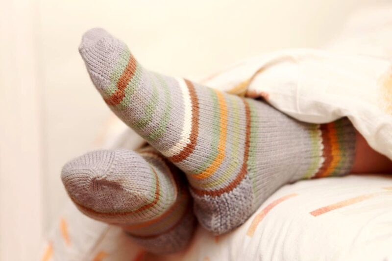 در حالی که پوشیدن جوراب در رختخواب ممکن است نتواند به تمام اختلالات خواب و بیداری کمک کند، شواهد نشان می دهند که گرم کردن پاها قبل از خواب واضحا علائم بی خوابی را کاهش می دهد. یک مطالعه معتبر نشان داد که گرم کردن پاها به مدت ۲۰ دقیقه قبل از خواب علائم بی خوابی را تسکین می دهد. همچنین به دنبال بررسی احساس خستگی در یک مطالعه جداگانه، افرادی که از بی خوابی رنج می بردند پس از گرم کردن دست ها و پاهای خود خواب بهتری را تجربه کردند.