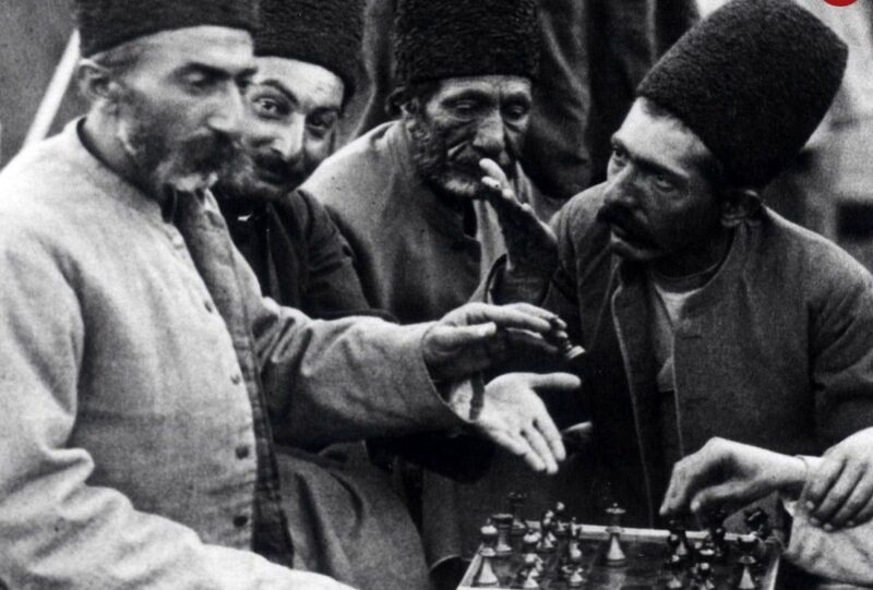 عکس دوم مربوط به یکی از سفرهای تفریحی شاه است. در زمان اتراق، جمعی از درباریان و همراهان شاه که از جملۀ آنها میرآخور و مجدالدوله هستند مشغول بازی شطرنج شدهاند. ژستی که حاضران در عکس گرفتهاند مایههایی از طنز و شوخی دارد که با دقت در جزئیات میتوان آنها را تشخیص داد.