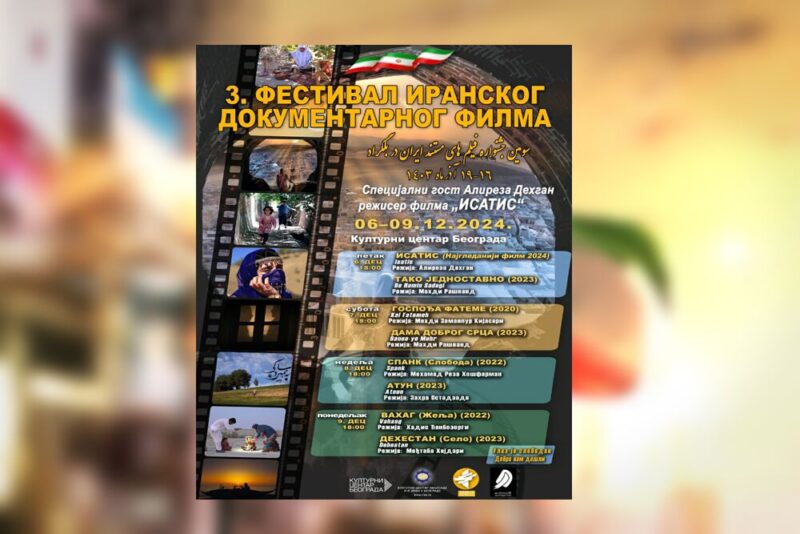 سومین جشنواره فیلم مستند ایران (۱۶ آذرماه) به همت رایزنی فرهنگی جمهوری اسلامی در صربستان و با مشارکت ادارهکل همکاریهای رسانهای و فضای مجازی سازمان فرهنگ و ارتباطات اسلامی، مرکز گسترش سینمای مستند، تجربی و انیمیشن، آژانس مستند سو و مرکز فرهنگی بلگراد برگزار خواهد شد.