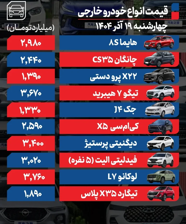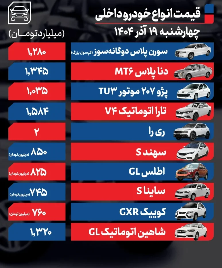 قیمت خودرو امروز 19 آذر 1404 از سوی بنگاه‌های معاملاتی اعلام شد.