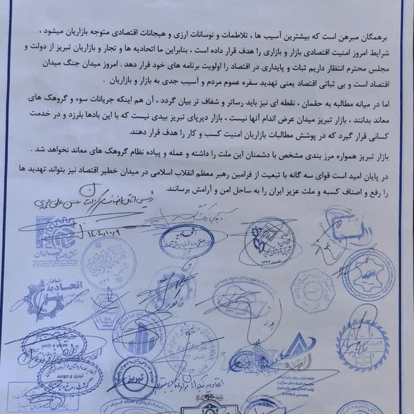 در ادامه این بیانیه آمده است: ما بهعنوان اتحادیههای اصناف تبریز، از دولت و مجلس شورای اسلامی انتظار داریم ثبات و پایداری اقتصادی را در اولویت برنامهها و فعالیتهای خود قرار دهند. امروز میدان جنگ، میدان اقتصاد است و بیثباتی اقتصادی، بهمعنای تحدید سفره مردم و وارد آمدن آسیب جدی به بازار و بازاریان عزیز است.