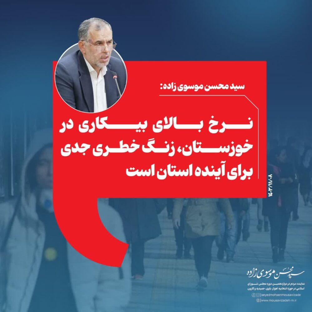 وی در ادامه گفت: در کنار خلأ صنایع تبدیلی، عملکرد صنایع بزرگ مستقر در استان نیز در رفع معضل بیکاری ناامیدکننده است. این صنایع نهتنها به وظایف اجتماعی خود عمل نمیکنند، بلکه در جذب نیروی کار بومی نیز تبعیض قائل میشوند. موسویزاده خاطر نشان کرد: در روند استخدام و الزام این صنایع به ایجاد فرصتهای شغلی برای جوانان خوزستانی از اولویتهای جدی است که باید پیگیری شود.موسویزاده در پایان یادآور شد: ادامه وضعیت فعلی میتواند تبعات اجتماعی و اقتصادی سنگینی برای استان داشته باشد. نرخ بالای بیکاری در استان خوزستان، زنگ خطری جدی برای آینده است. وی افزود: دولت باید با سرمایهگذاری در بخشهایی مانند صنایع تبدیلی و ملزم کردن صنایع بزرگ به ایفای مسئولیتهای اجتماعی خود، برای حل این بحران اقدام کند. ما به نمایندگی از مردم خوزستان، این مسئله را در اولویتهای کاری خود قرار دادهایم و اجازه نخواهیم داد این استان همچنان قربانی سوءمدیریت و بیتوجهی شود.