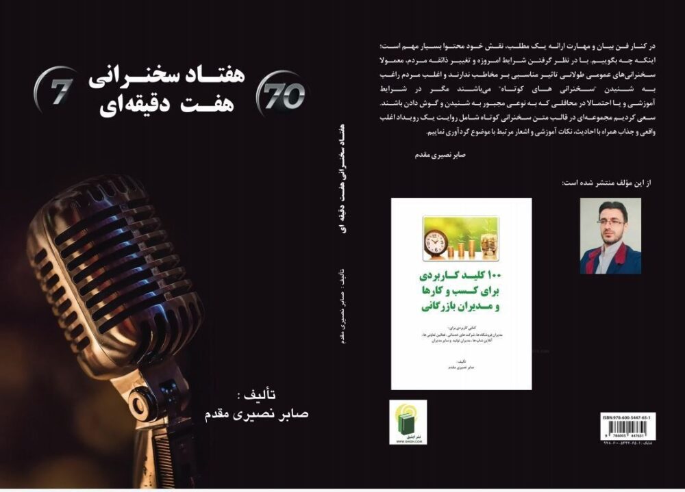 به گزارش دیدگاه نیوز،،کتابی با عنوان (۷۰سخنرانی ۷دقیقه ای) ۱۴۸ صفحه دارد و توسط انتشارات ایشیق تبریز چاپ و منتشر شده است. صابر نصیری مقدم مولف این کتاب و فعال اجتماعی اهل مرند میگوید: گردآوری این کتاب دوسال زمان برده و در قطع رقعی و شمارگان هزار نسخه چاپ شده است