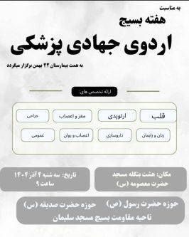 ۰۴ آذر برگزاری اردوی جهادی پزشکی به مناسبت هفته بسیج در شهرستان مسجدسلیمان ستوان دوم پاسدار جمالی در مصاحبه با خبرنگار دیدگاه نیوز از برگزاری اردوی جهادی پزشکی در شهرستان مسجدسلیمان به مناسبت هفته بسیج خبر داد